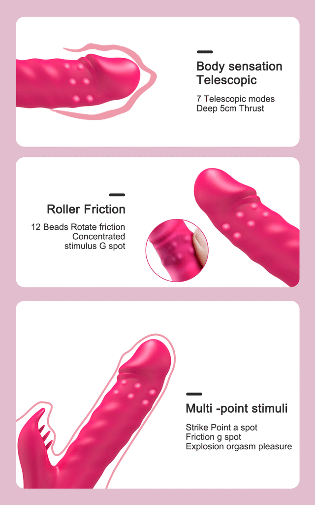 - 3 types de poussée, pendant que la partie extérieure s'occupe de votre clitoris, la partie intérieure use de différents types de poussées pour vous donner un effet de va-et-vient prononcé dans le but d'atteindre votre point G