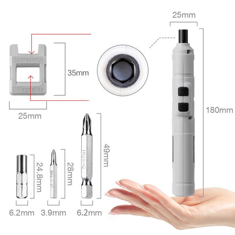 Le mini tournevis électrique est très facile à utiliser : Il suffit d’installer la vis convenable à la tête de transmission, et utilisez les deux modes de transmission (en avant et en arrière). Vous pouvez également recharger votre tournevis simplement à travers le câble USB, et profitez d’une autonomie de batterie dépassant les 1100mAH.