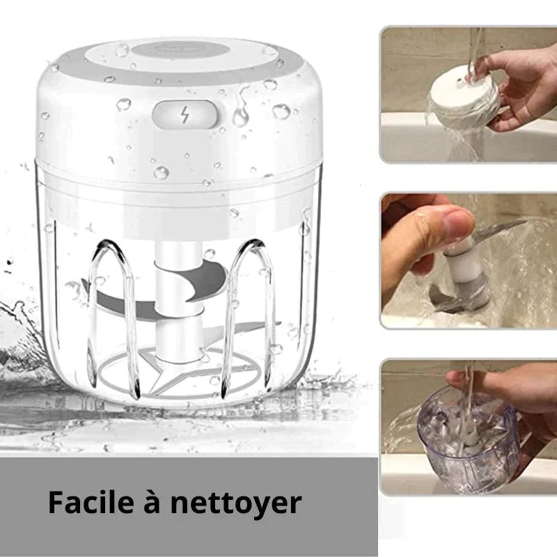 Grâce à son format compact et sa batterie intégrée, rechargeable facilement à travers son câble USB, le nouveau hachoir multifonctionnel vous suivra là où vous voulez, pour préparer vos repas sans avoir à être encombré par des fils ou à porter d'appareil volumineux.