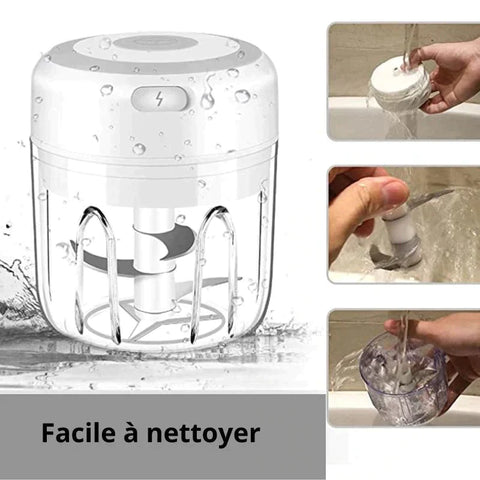 Pour nettoyer votre mini hachoir électrique, il vous suffit de séparer le bol et la lame qui sont compatibles avec un lave-vaisselle pour un nettoyage tout aussi rapide et de passer le hachoir sous l'eau pour le nettoyer.