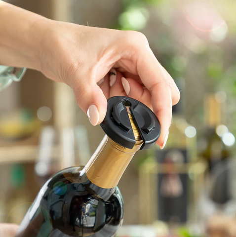- D'un bouchon à vide - Une fois ouvert, pour conserver le vin dans des conditions optimales, il suffit d'insérer le bouchon à vide dans la bouteille et de déplacer le piston de haut en bas pour éliminer tout l'air de l'intérieur.