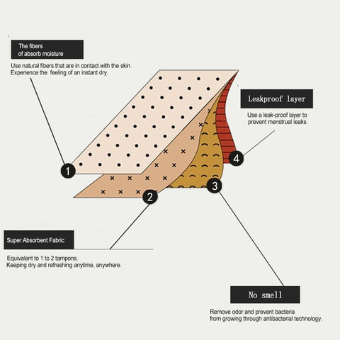 En plus d'être jolies économiques, écologiques et réutilisables nos culottes sont composées de 4 couches protectrices afin d'éviter tout risque de fuites même en cas de flux abondants :