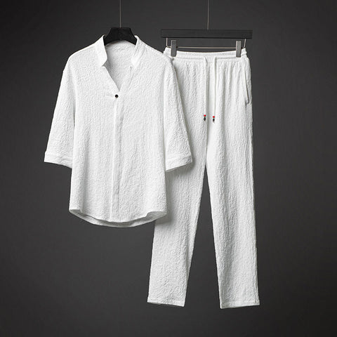 L'ensemble est taillé de manière à offrir une coupe confortable et ajustée, mettant en valeur votre silhouette masculine. L'ensemble est composé de 2 pièces ! La chemise présente une encolure classique et des finitions soignées. Tandis que le pantalon est doté d'une taille élastique pour un ajustement personnalisé et un confort optimal.