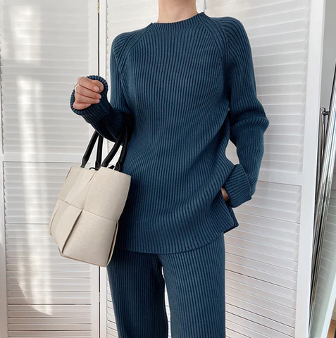Découvrez notre nouvel ensemble d'automne 2022 : un ensemble composé d'un pull et pantalon en tricot côtelé, pour un passer un bel automne et hiver au chaud et confort ! Nos promesses ? Confort, style et classe assuré !
