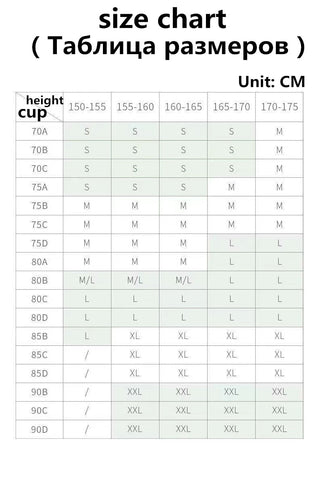 - Tailles : S : 70 ABC, 75 A / M : 75 BCD, 80 AB / L : 80 BCD, 85 B / XL : 85 BCD XXL : 90 BCD